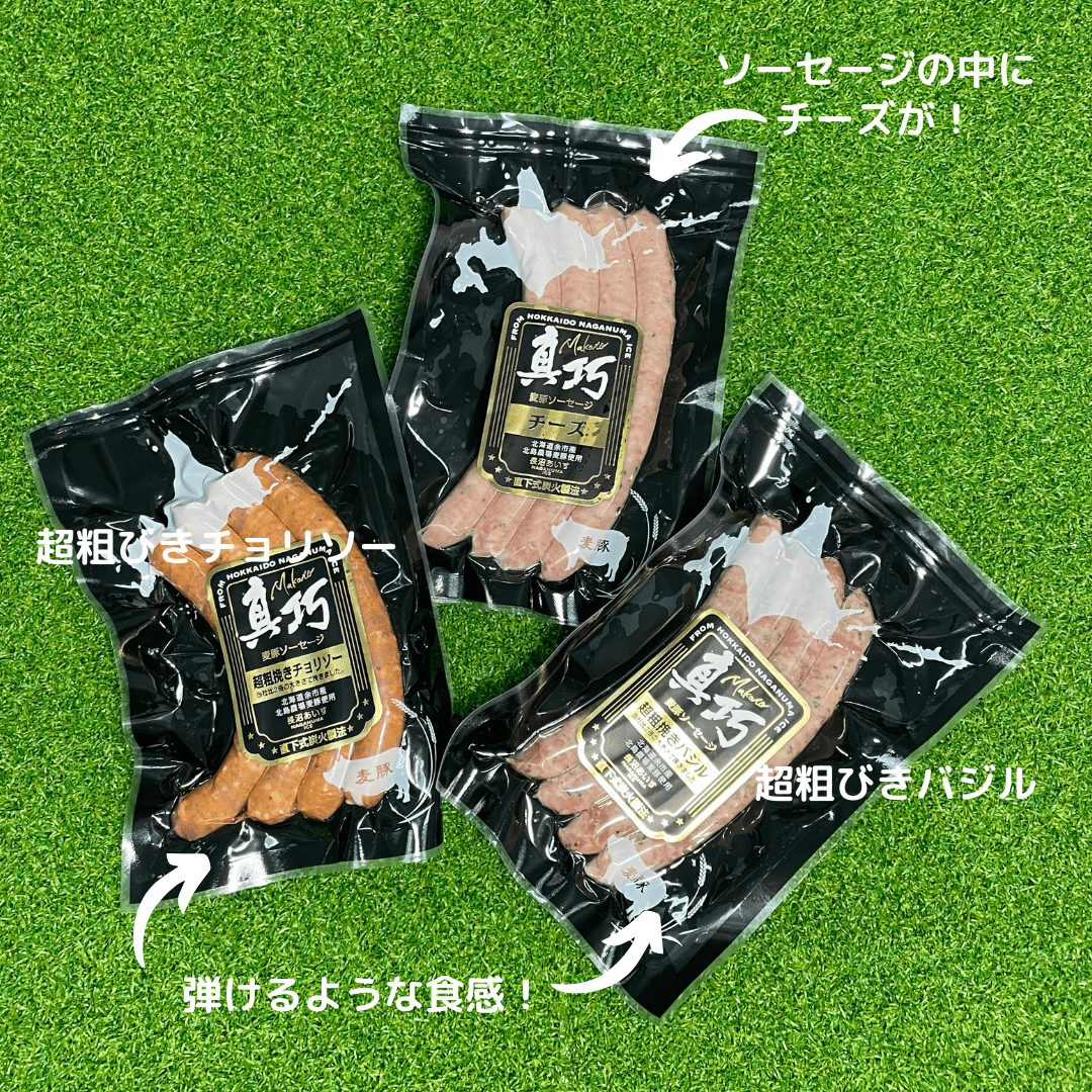 「超あらびきウィンナー(バジル)」「超あらびきウィンナー(辛口)」「チーズ入ウィンナー(カチョカバロ入)」の3種をセットにしました。