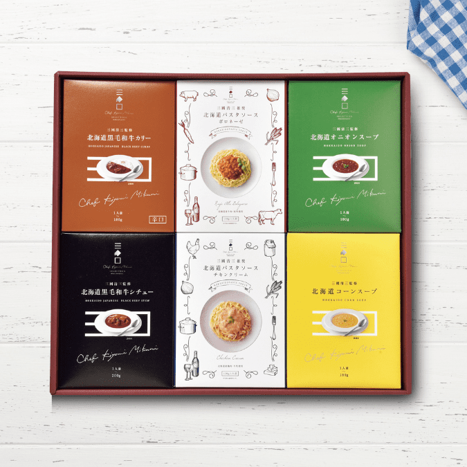 肉の旨さと柔らかさに定評がある北海道の和牛ブランド「ふらの和牛」。そのビーフを使用したカレーやシチュー、タマネギととうもろこしの自然の味を生かしたスープ。さらに北海道の大自然の恵みを使って作られたパスタソースを2種類詰合せました。