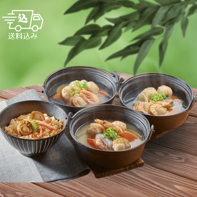 電子レンジで温めるだけで簡単に食べられる、各種お一人様分の詰合せです。海鮮のうまみが詰まった鍋・汁・おこわをお手軽にお楽しみください。
