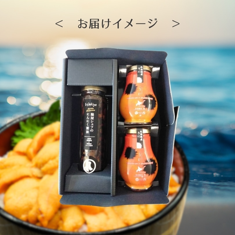 大好評の「北海道産うにソース」「脇屋シェフのにんにく醤油」をセットにした商品です。これぞ北海道の味!!贈り物にお勧めです。